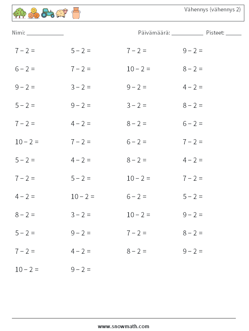 (50 matemaattista kysymystä) Tulosta vähennyslaskentataulukot, vähennä 2, lasten matematiikka