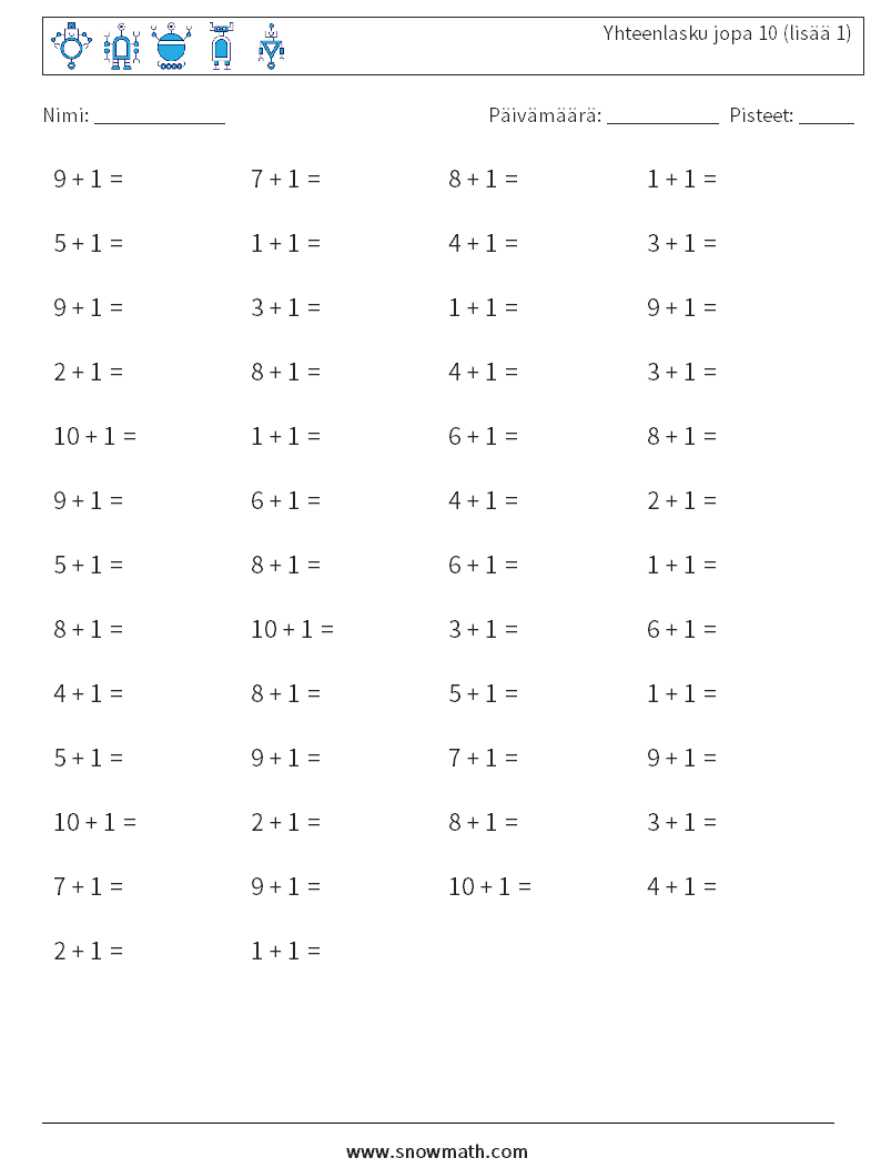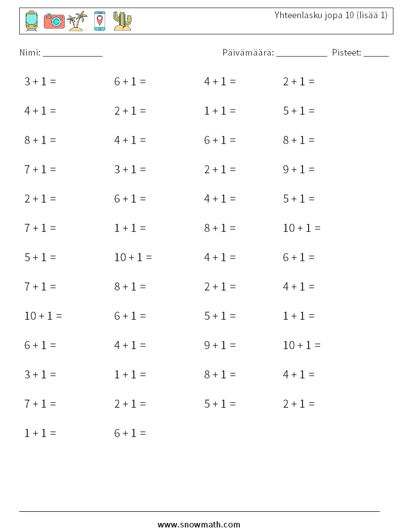 (50) Yhteenlasku jopa 10 (lisää 1) Matematiikan laskentataulukot 3