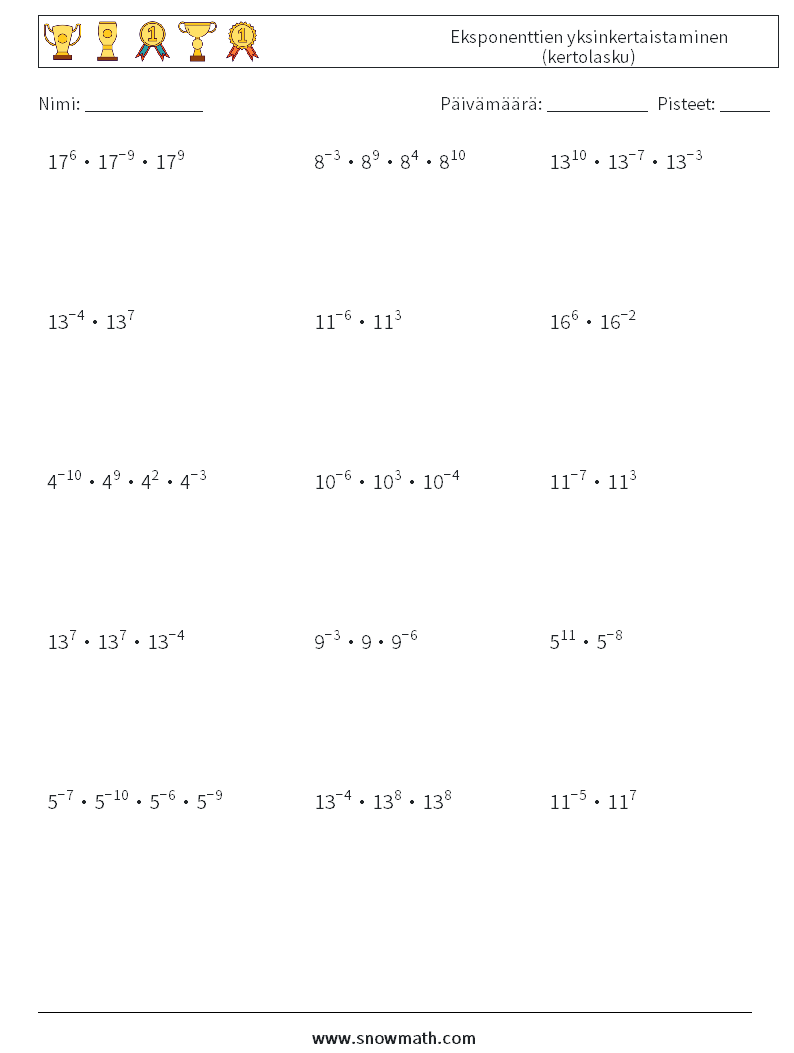 Eksponenttien yksinkertaistaminen (kertolasku) Matematiikan laskentataulukot 6