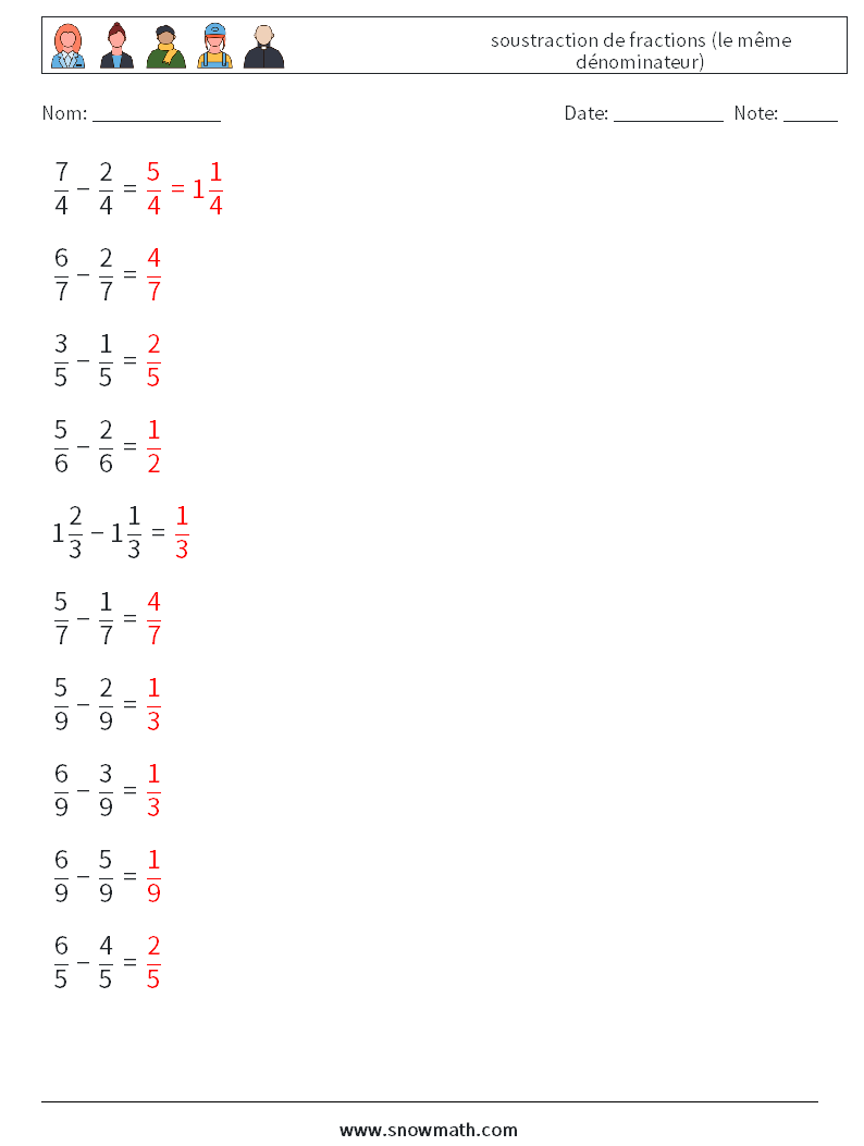 (10) soustraction de fractions (le même dénominateur)