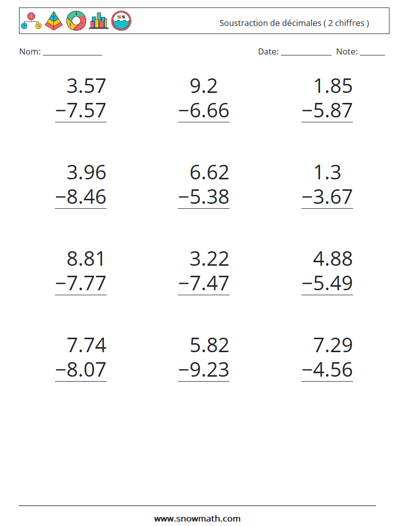(12) Soustraction de décimales ( 2 chiffres ) Fiches d'Exercices de Mathématiques 12