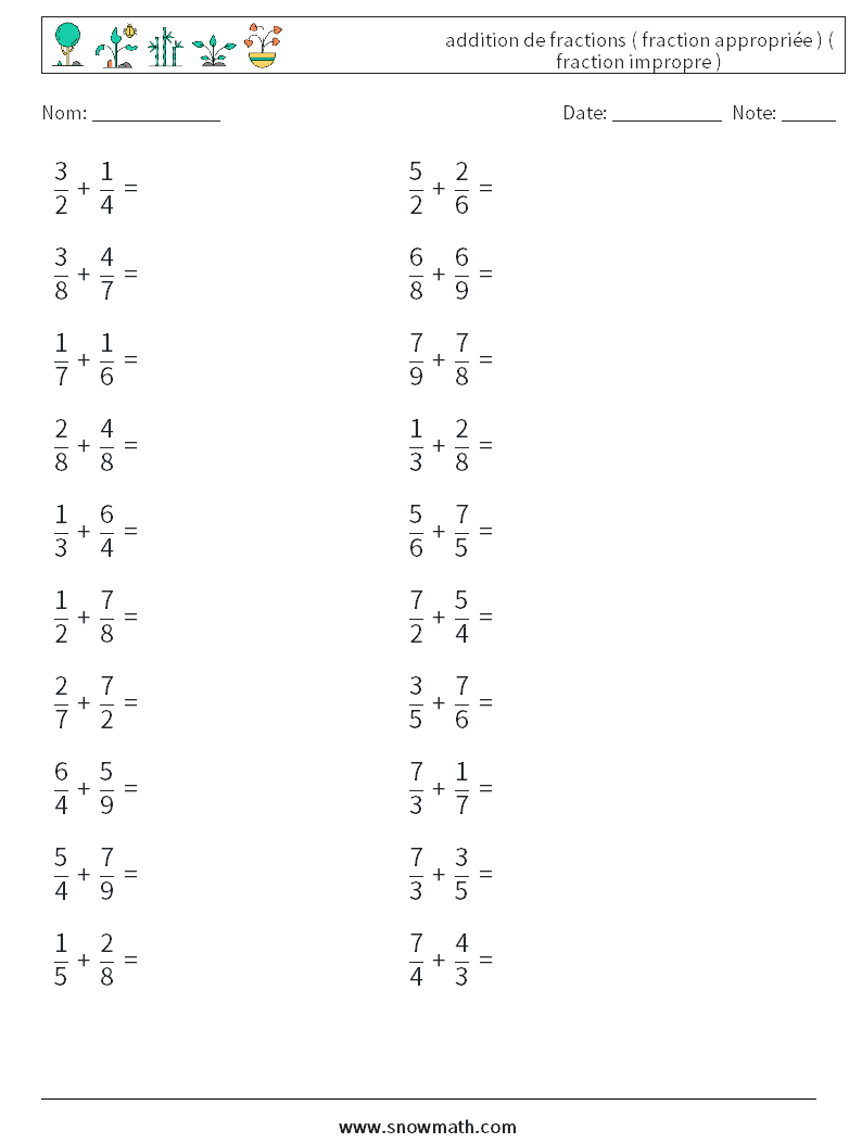 (20) addition de fractions ( fraction appropriée ) ( fraction impropre ) Fiches d'Exercices de Mathématiques 2