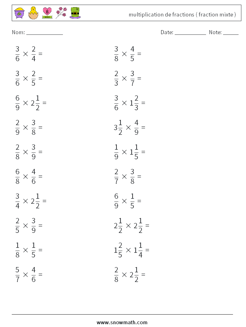 (20) multiplication de fractions ( fraction mixte ) Fiches d'Exercices de Mathématiques 2