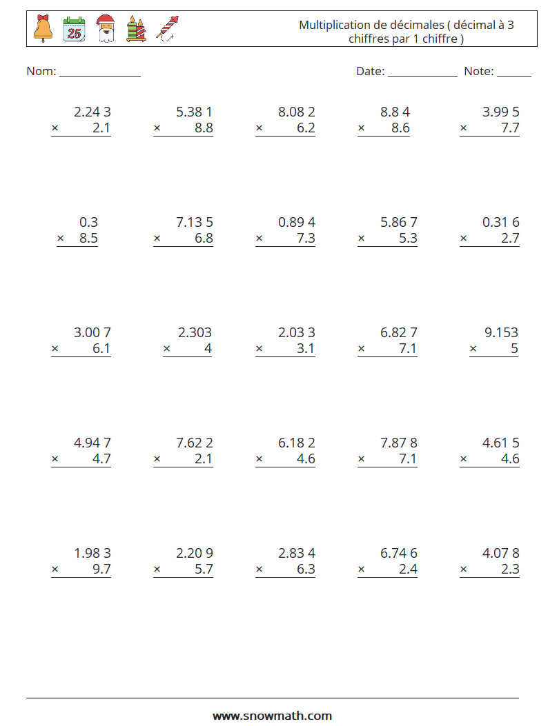 (25) Multiplication de décimales ( décimal à 3 chiffres par 1 chiffre ) Fiches d'Exercices de Mathématiques 1