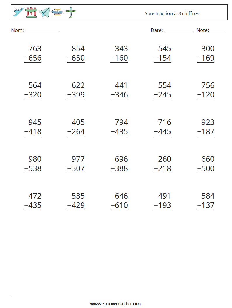(25) Soustraction à 3 chiffres Fiches d'Exercices de Mathématiques 12