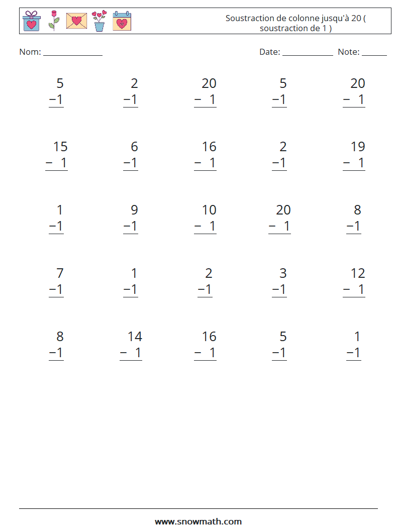 (25) Soustraction de colonne jusqu'à 20 ( soustraction de 1 )