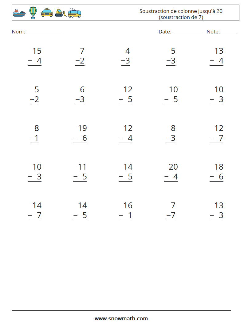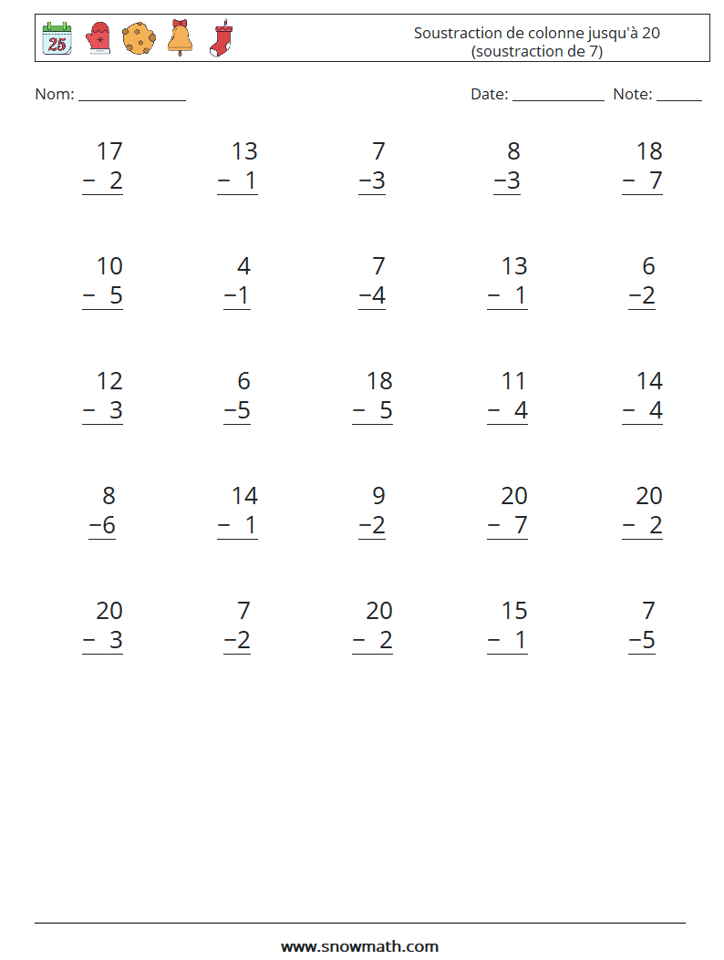 (25) Soustraction de colonne jusqu'à 20 (soustraction de 7)