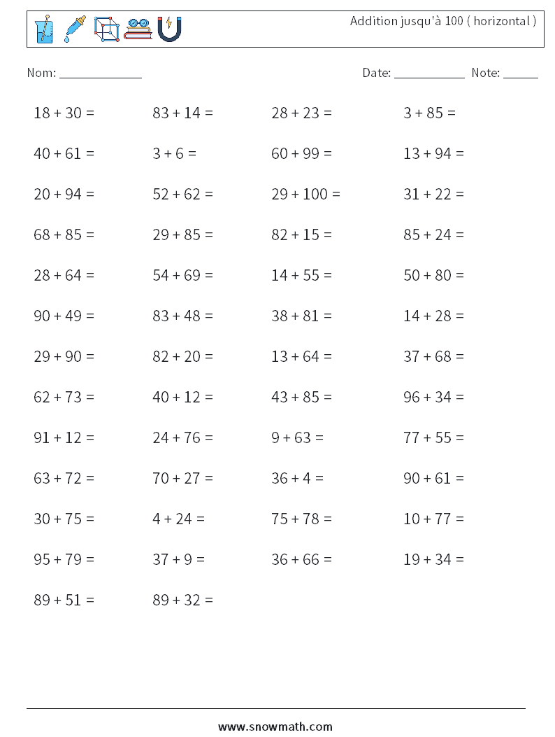 (50) Addition jusqu'à 100 ( horizontal ) Fiches d'Exercices de Mathématiques 1