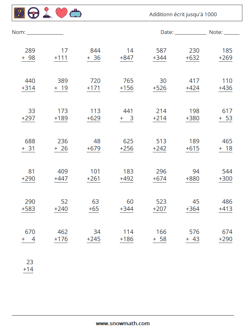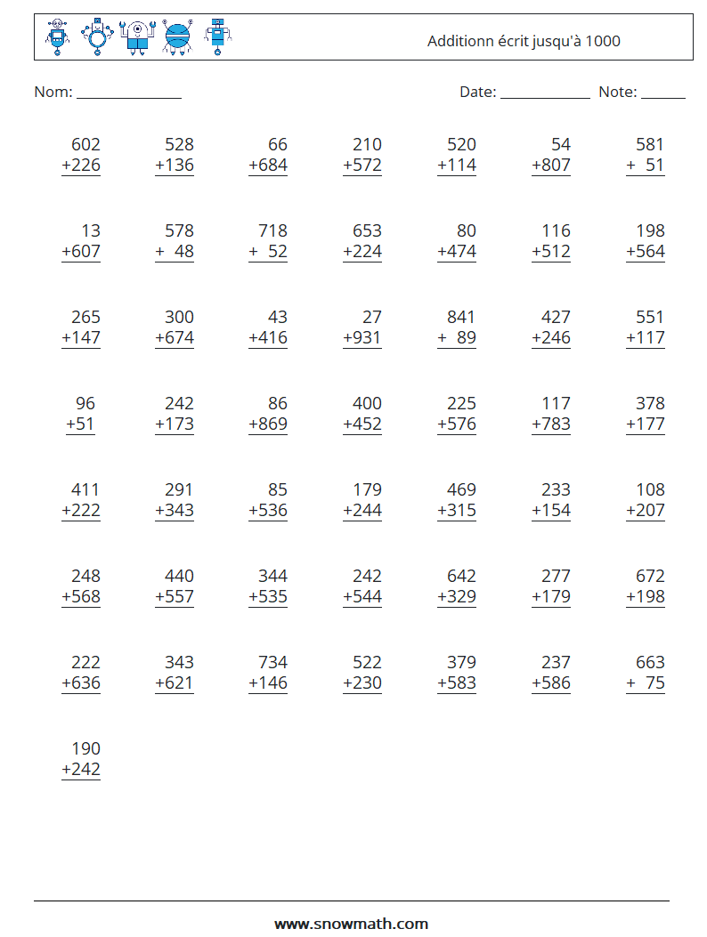(50 questions de mathématiques) Étude écrite Additionn jusqu'à 1000. feuilles de calcul imprimables à télécharger.