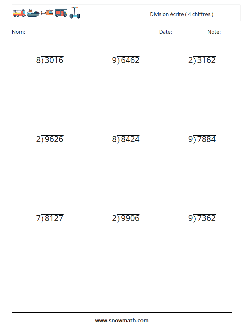 (9 questions de mathématiques) Pratiquez la division écrite, en divisant à 4 chiffres
