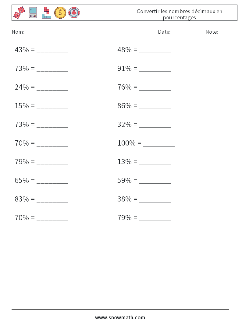 Convertir les nombres décimaux en pourcentages Fiches d'Exercices de Mathématiques 2
