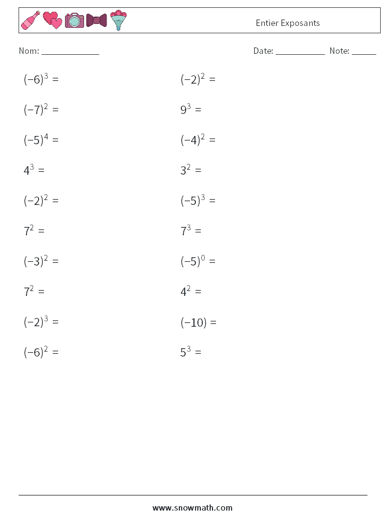 Exposants entiers, feuilles de calcul mathématiques gratuites.