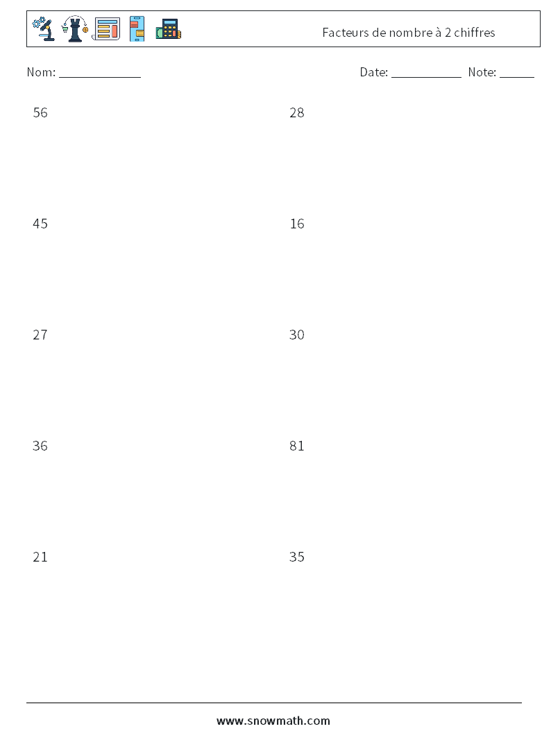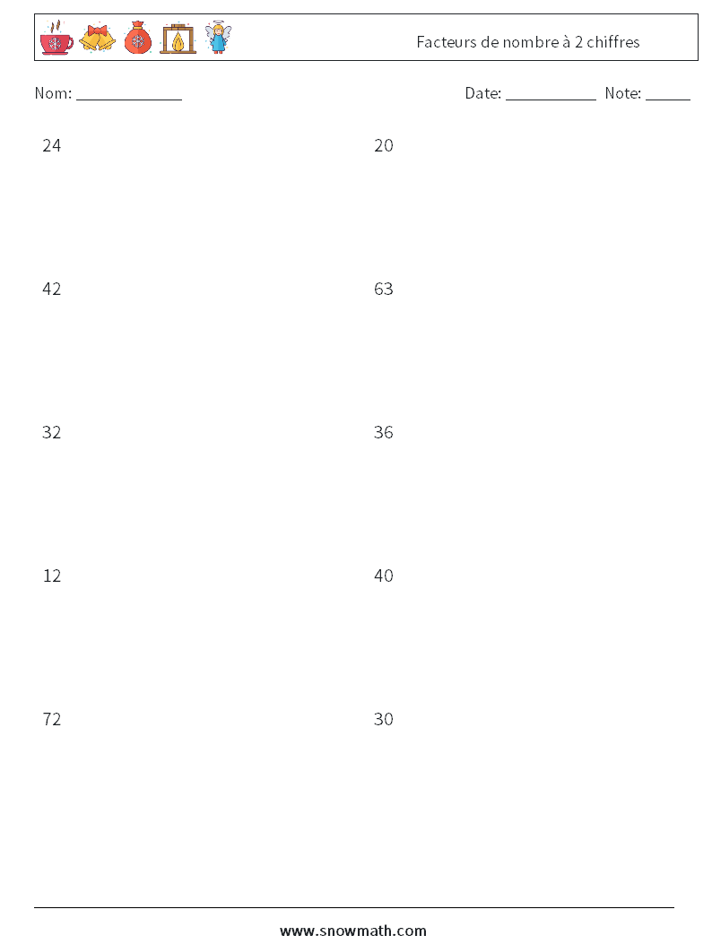 Facteurs de nombre à 2 chiffres Fiches d'Exercices de Mathématiques 5