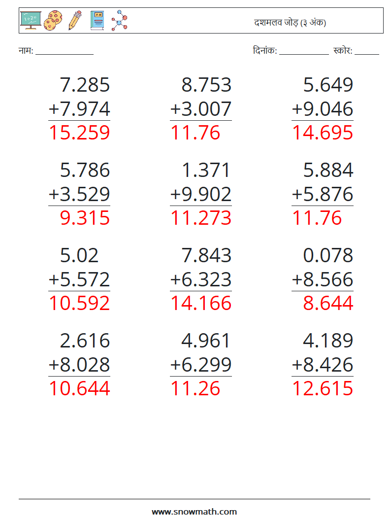 (12) दशमलव जोड़ (३ अंक)