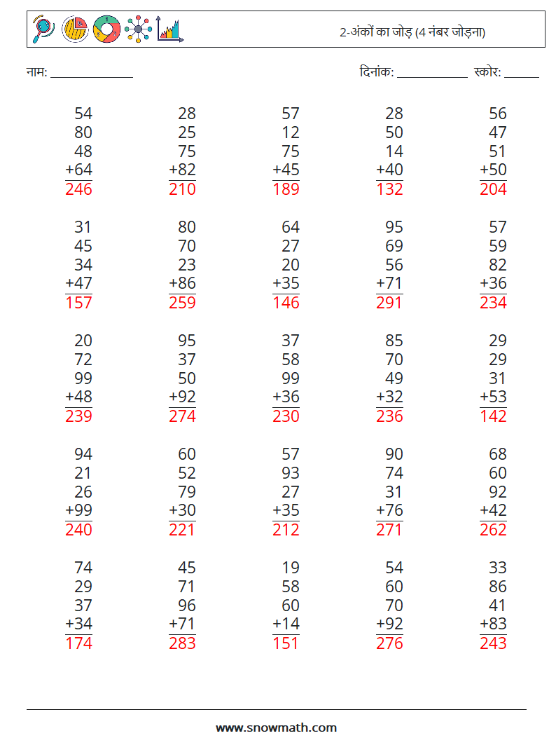 (25) 2-अंकों का जोड़ (4 नंबर जोड़ना)
