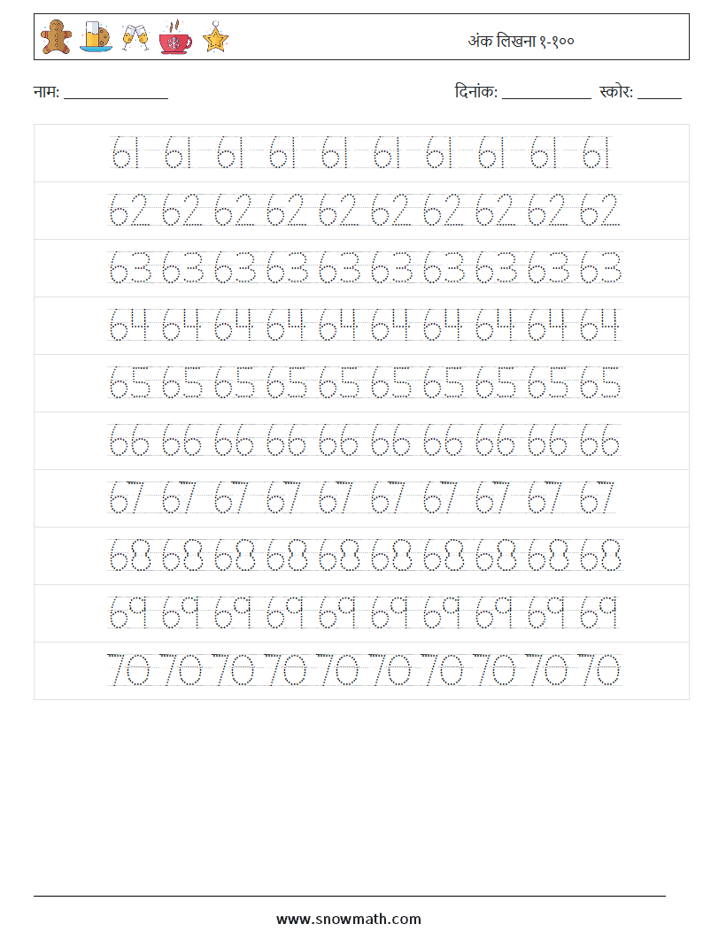 अंक लिखना १-१०० गणित कार्यपत्रक 10