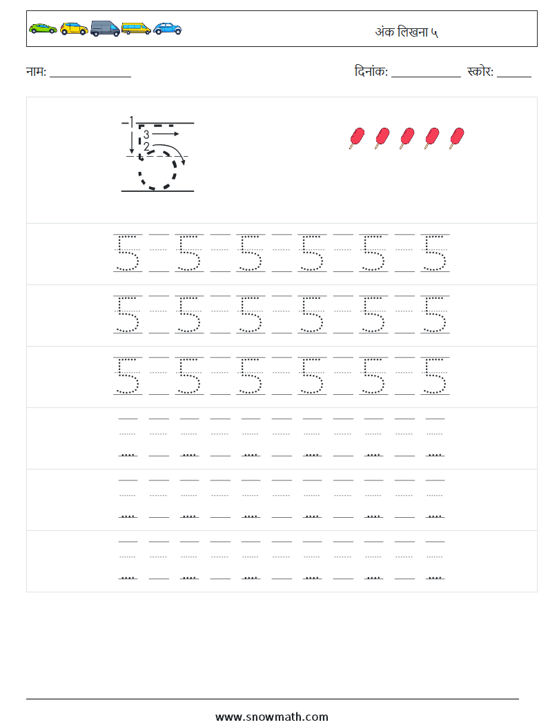 संख्याएं सीखें, नंबर 5 लिखें, प्रिंट करने योग्य पीडीएफ वर्कशीट