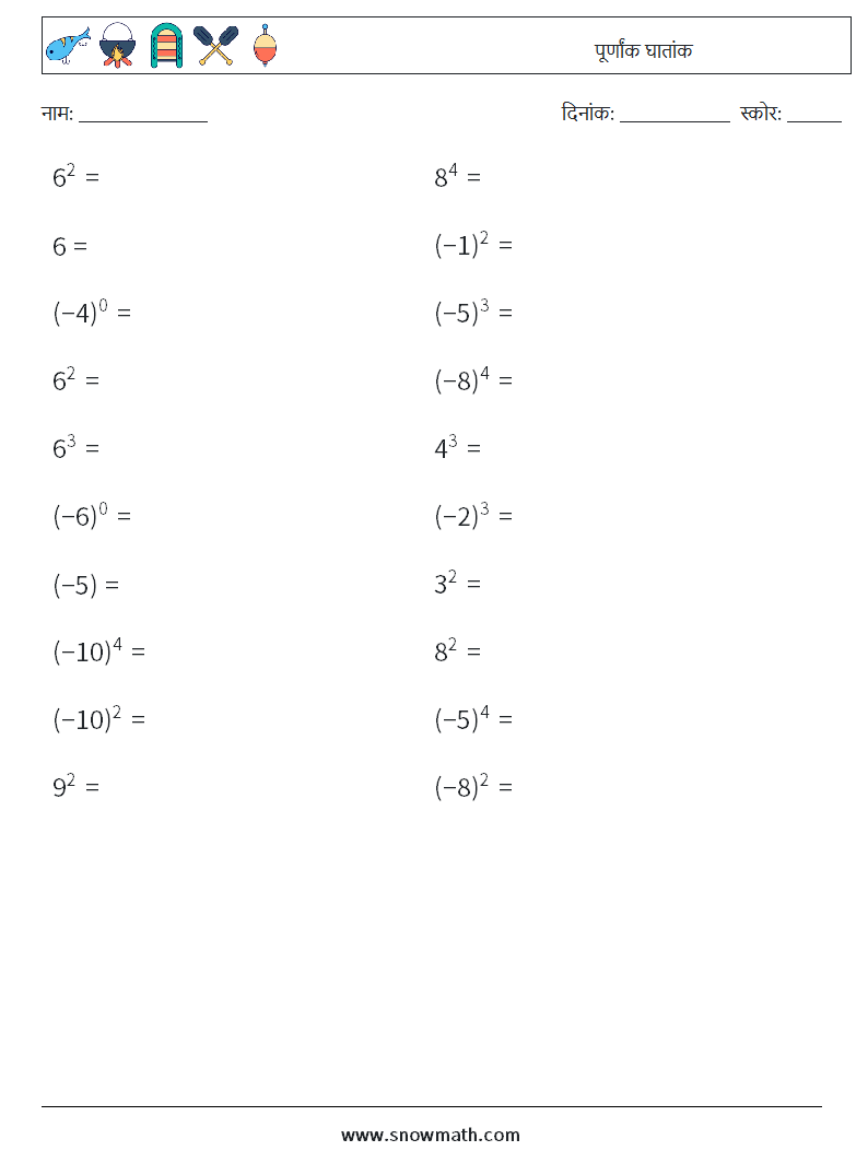 पूर्णांक घातांक, मुफ्त गणित कार्यपत्रक।