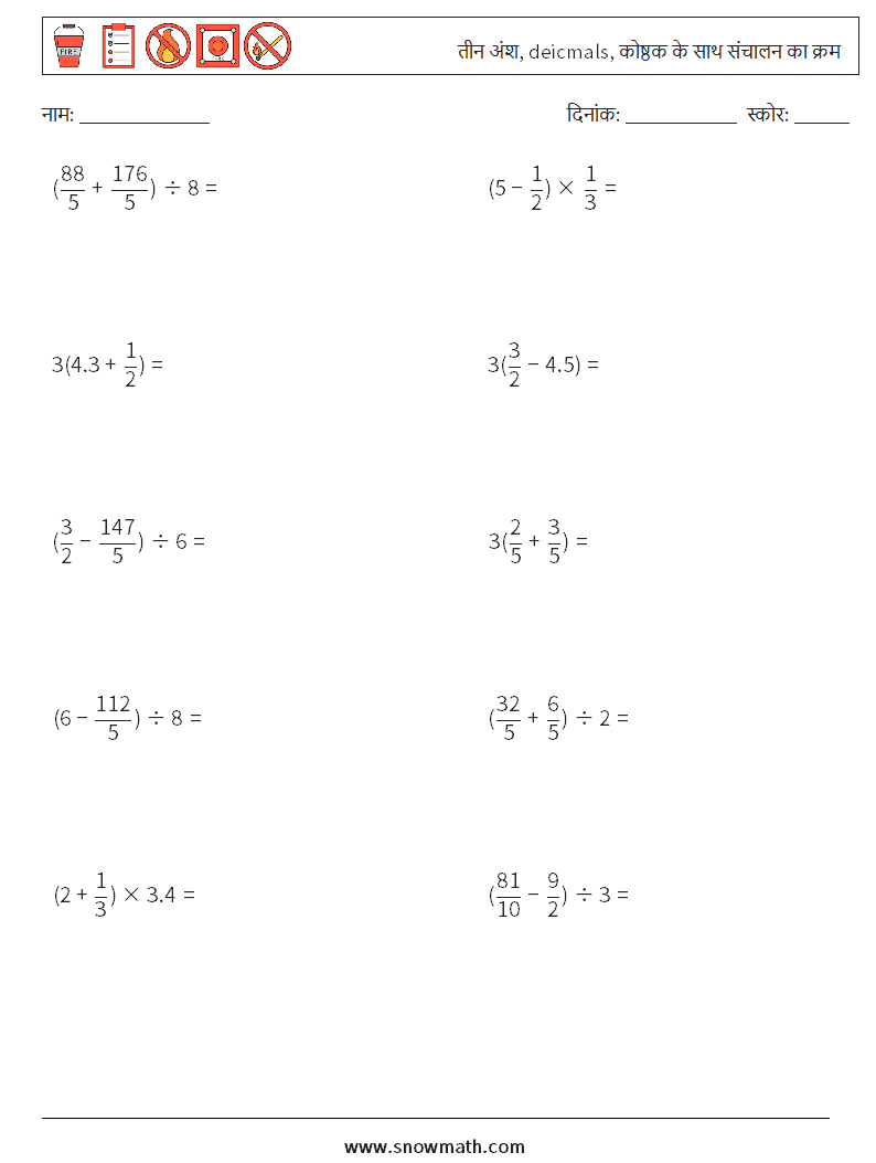 (10) तीन अंश, deicmals, कोष्ठक के साथ संचालन का क्रम गणित कार्यपत्रक 5