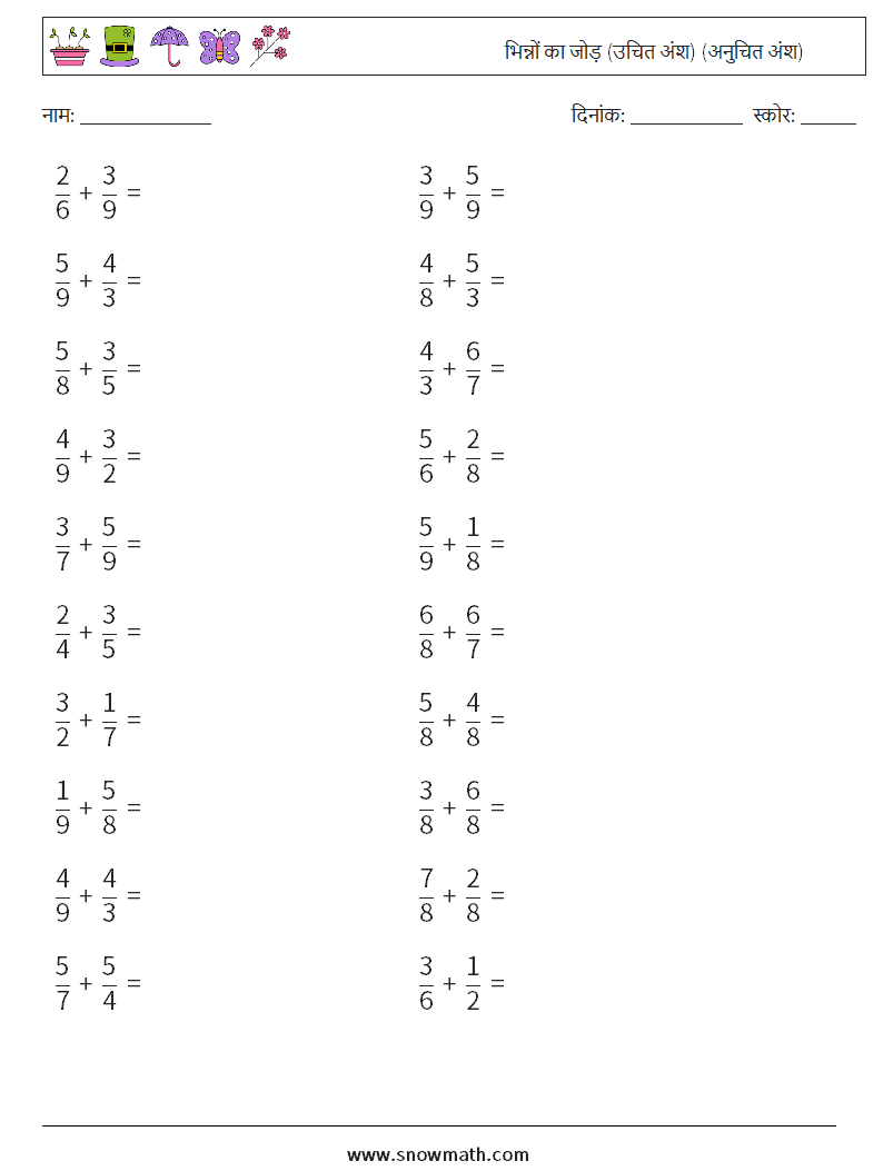 (20) भिन्नों का जोड़ (उचित अंश) (अनुचित अंश) गणित कार्यपत्रक 9