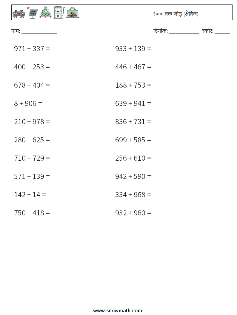 (20) १००० तक जोड़ (क्षैतिज) गणित कार्यपत्रक 3