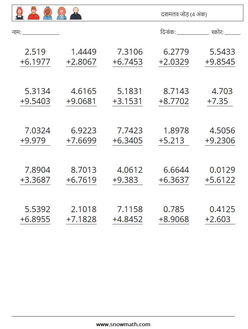 (25) दशमलव जोड़ (4 अंक) गणित कार्यपत्रक 1