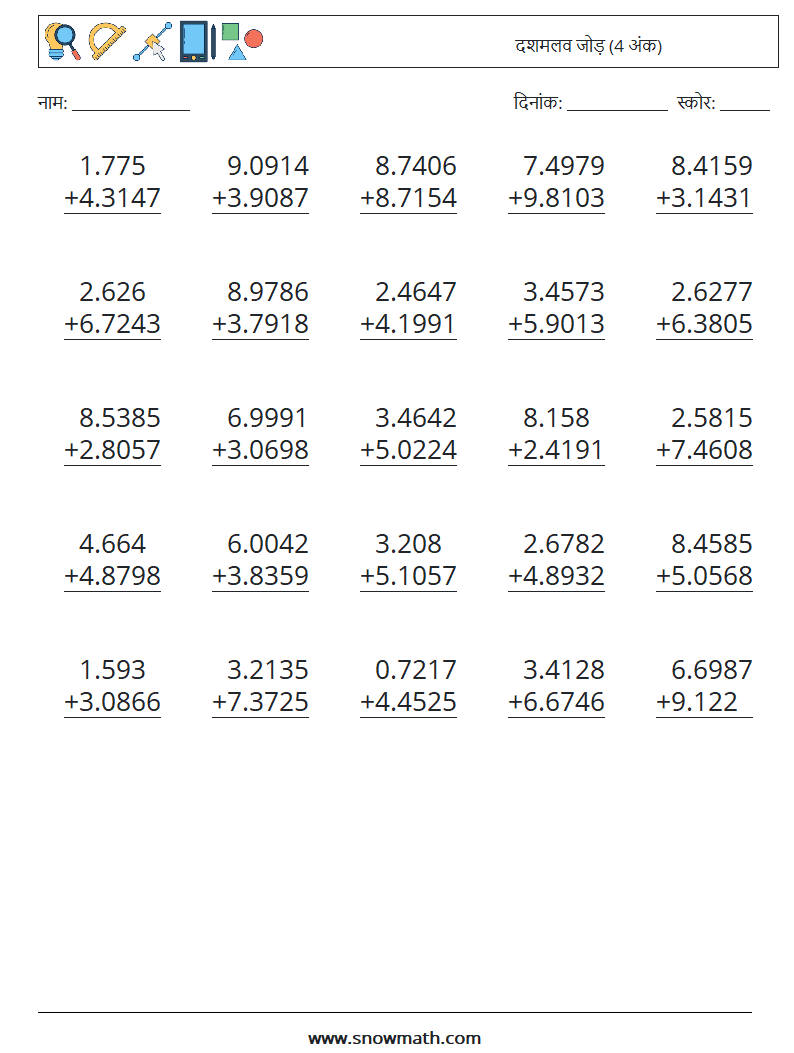 (25) दशमलव जोड़ (4 अंक) गणित कार्यपत्रक 9