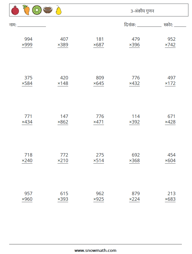 (गणित के 25 प्रश्न) 3-अंकीय गुणन कार्यपत्रकों का अभ्यास करें।