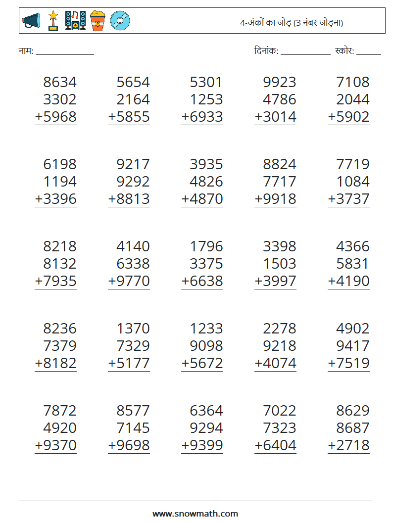 (25 गणित प्रश्न) तीन 4-अंकीय संख्याओं को जोड़कर, प्रिंट करने योग्य गणित कार्यपत्रकों को जोड़ना सीखें।