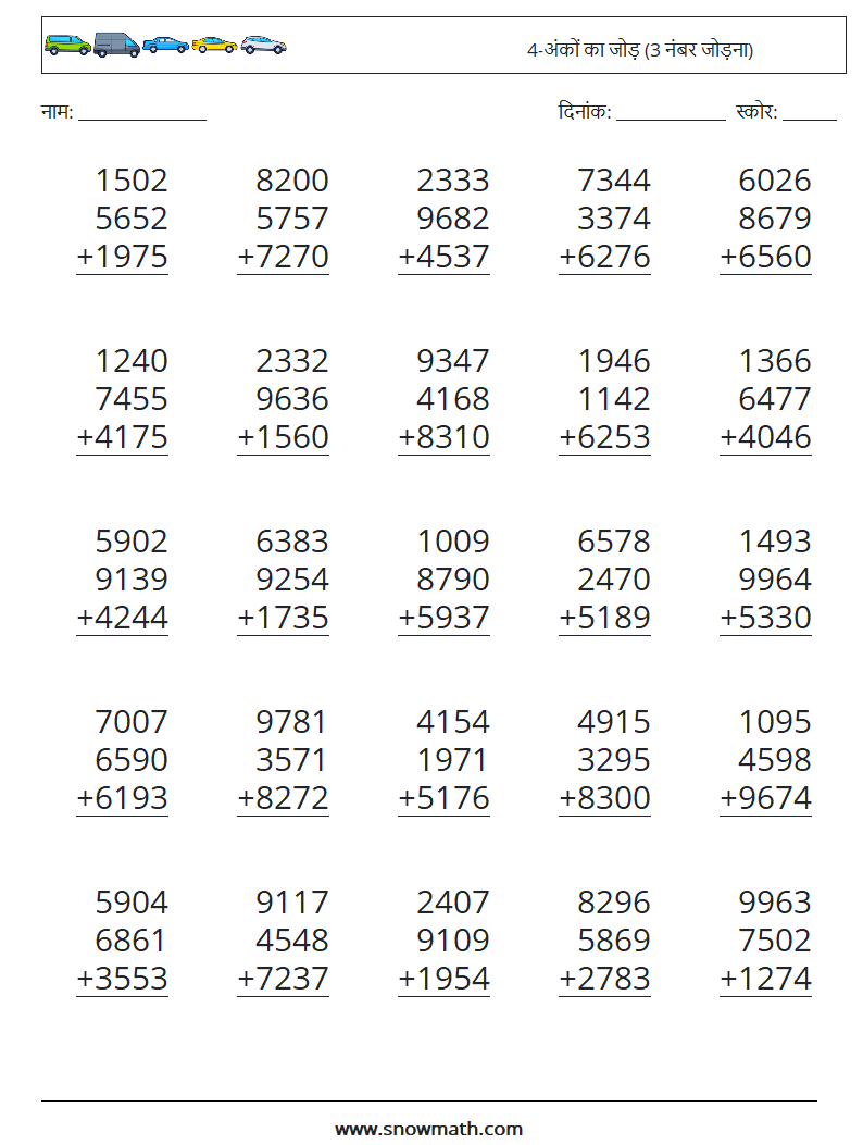 (25) 4-अंकों का जोड़ (3 नंबर जोड़ना) गणित कार्यपत्रक 10
