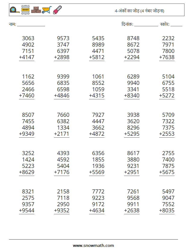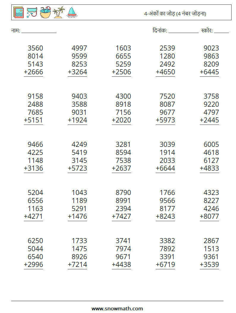 (25) 4-अंकों का जोड़ (4 नंबर जोड़ना) गणित कार्यपत्रक 4