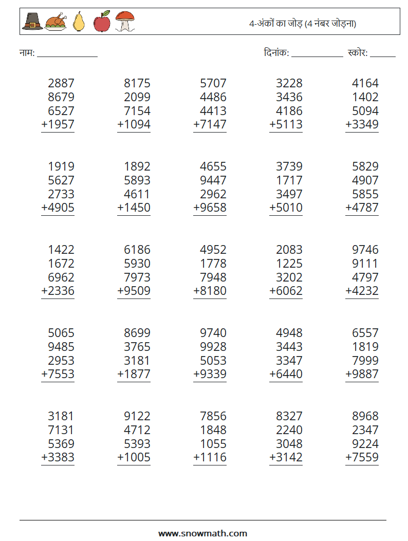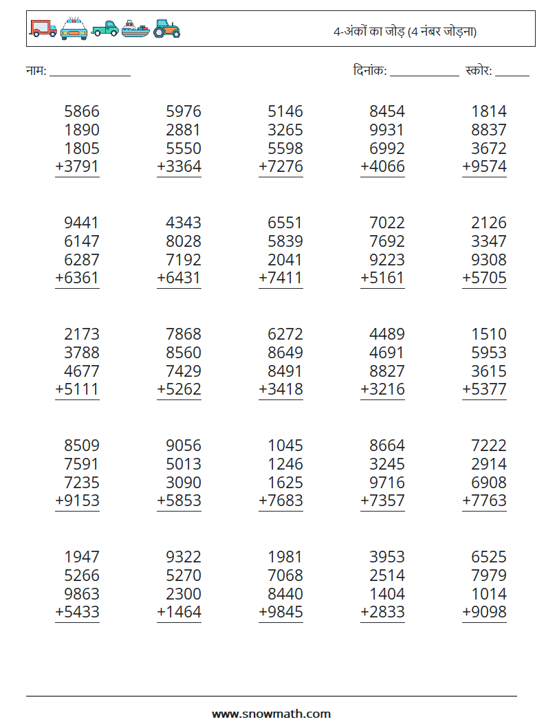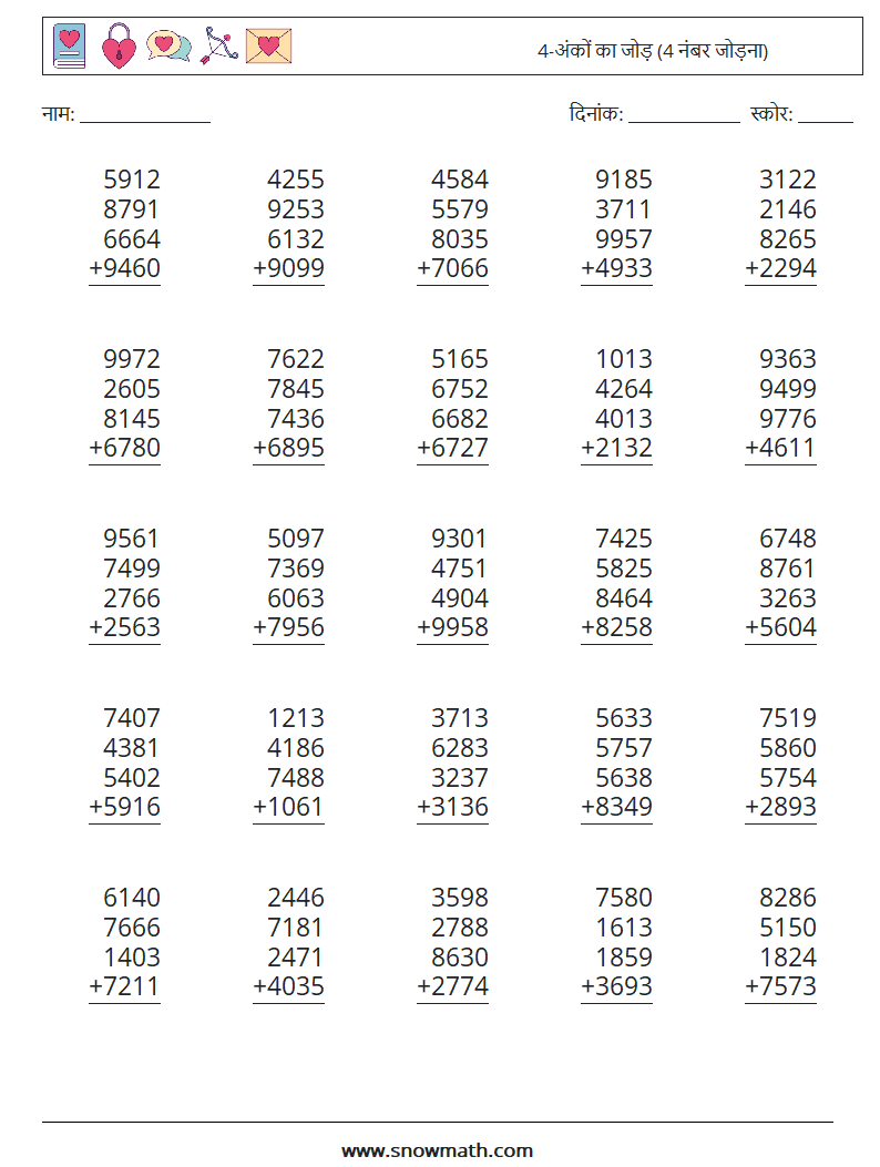 (25 गणित प्रश्न) चार 4 अंकों की संख्या, प्रिंट करने योग्य गणित कार्यपत्रक जोड़कर अतिरिक्त सीखें।
