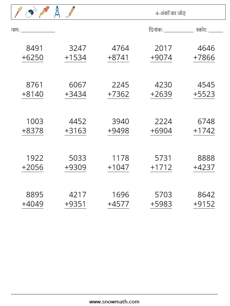 (25) 4-अंकों का जोड़ गणित कार्यपत्रक 5