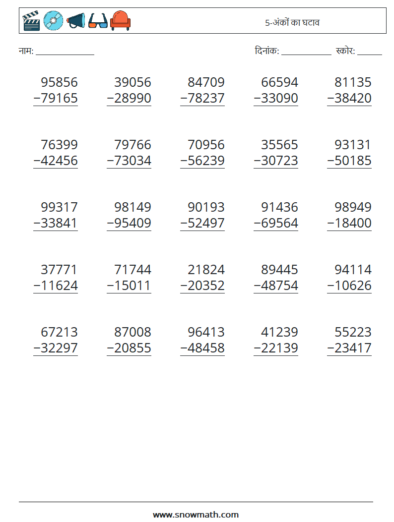 (25) 5-अंकों का घटाव गणित कार्यपत्रक 12