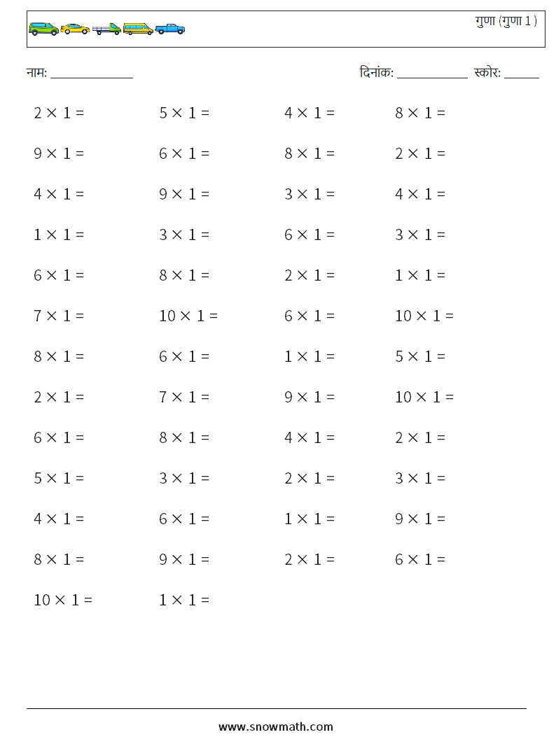 (गणित के ५० प्रश्न) गुणन कार्यपत्रक प्रिंट करें (१ से गुणा करके)