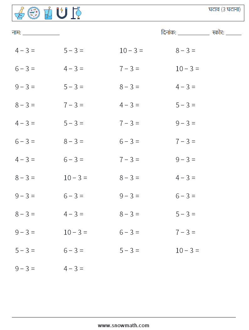 (50) घटाव (3 घटाना) गणित कार्यपत्रक 1