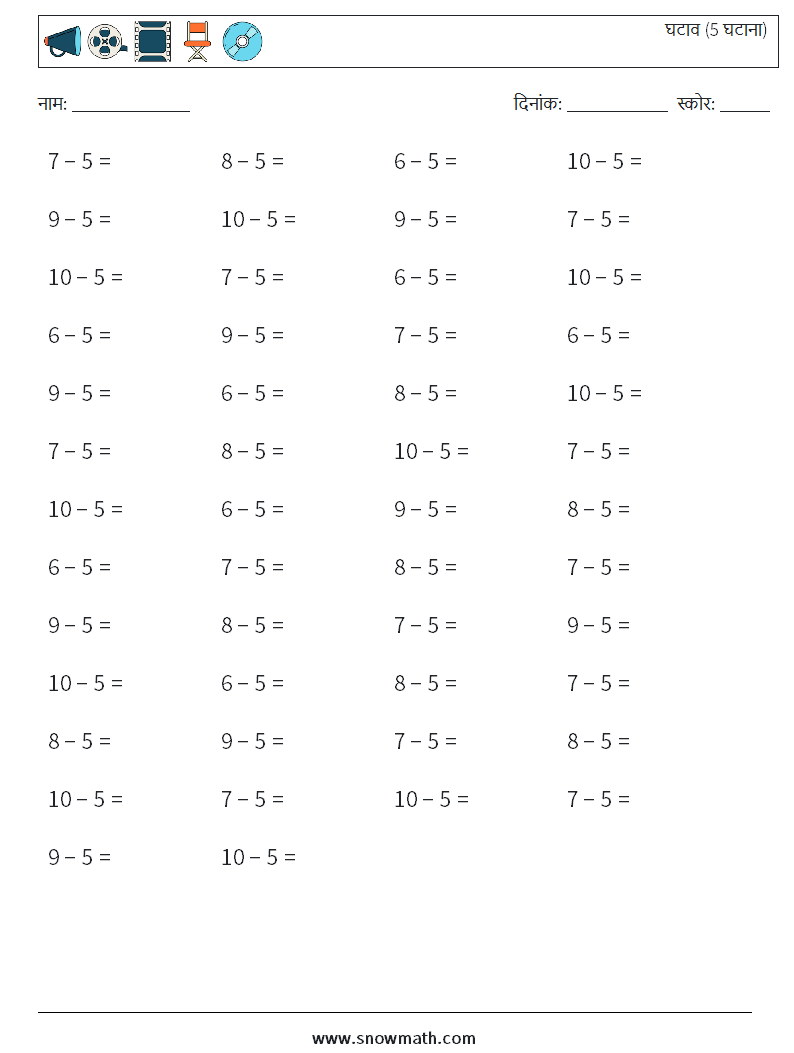 (50) घटाव (5 घटाना) गणित कार्यपत्रक 7