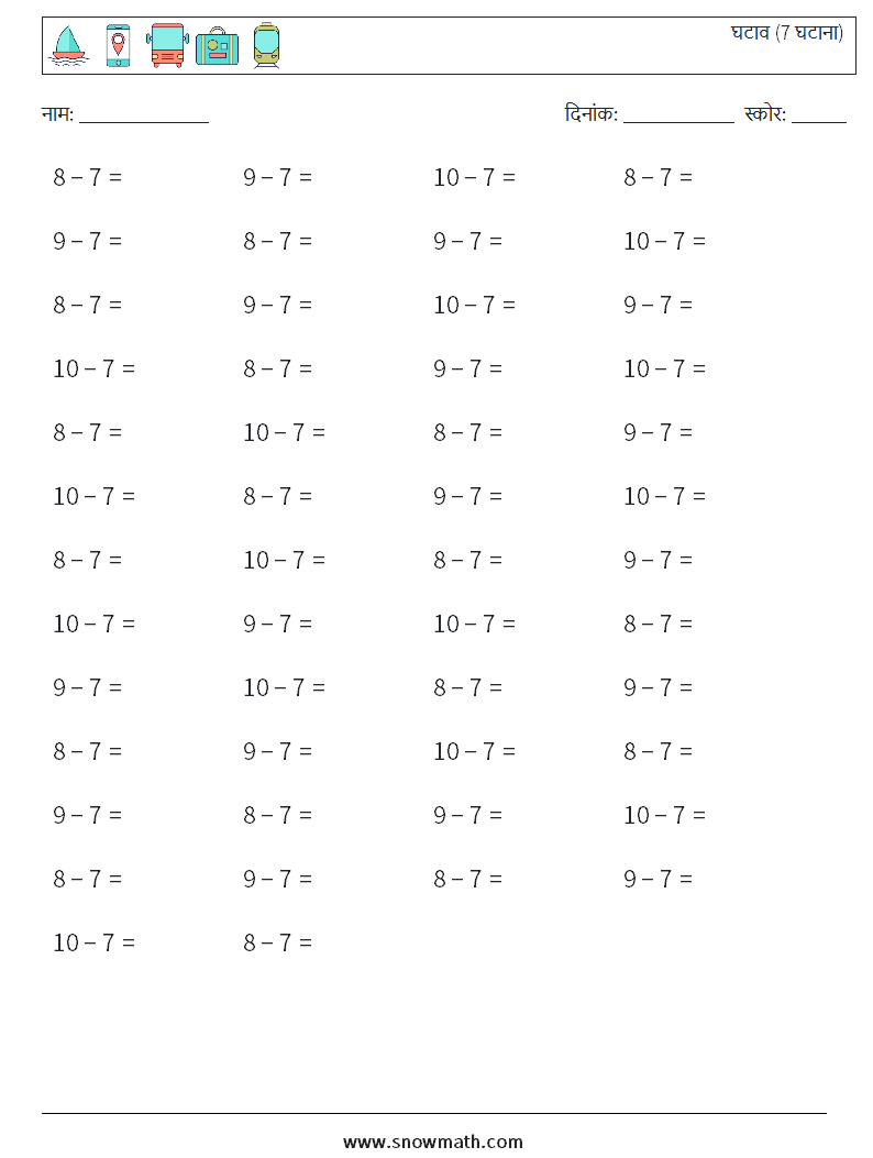 (५० गणित के प्रश्न) घटाव का अभ्यास करें, ७ घटाकर, गणित की वर्कशीट।