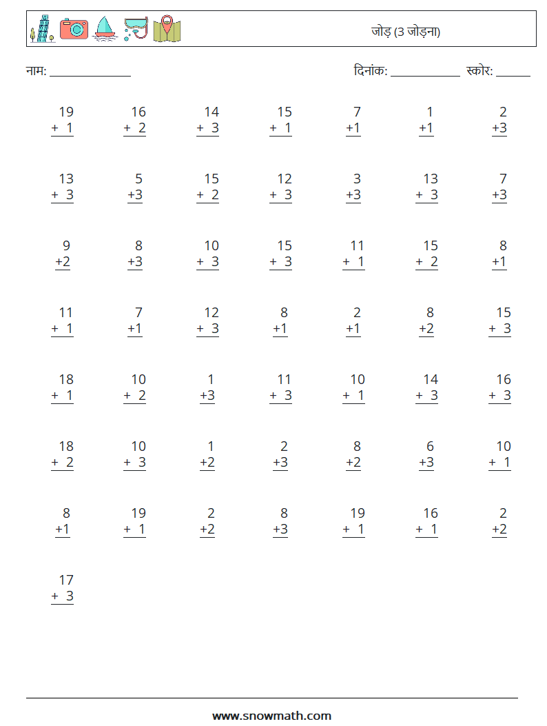 (50) जोड़ (3 जोड़ना) गणित कार्यपत्रक 16