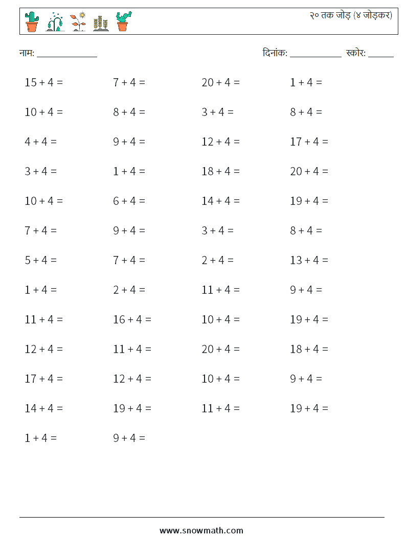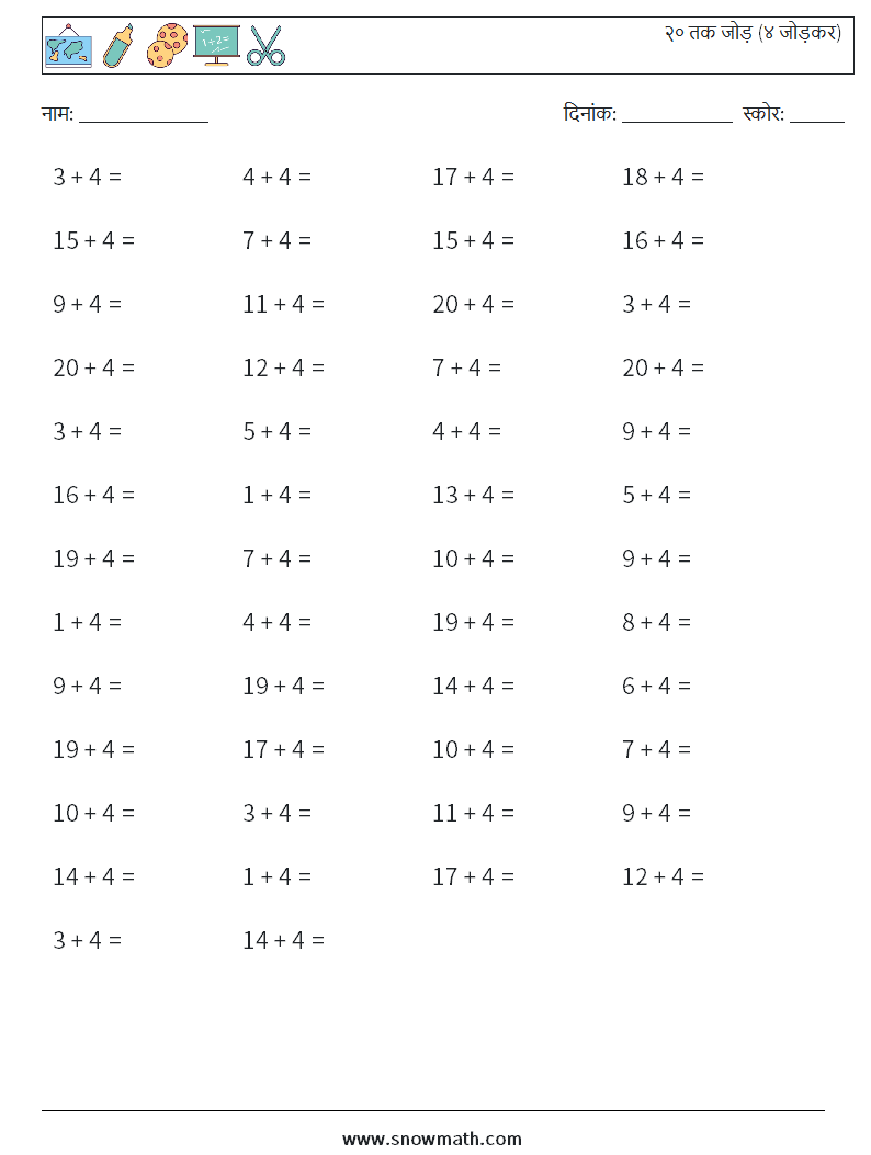 (५० गणित के प्रश्न) २० के भीतर जोड़, गणित की वर्कशीट प्रिंट करें, ४ जोड़कर