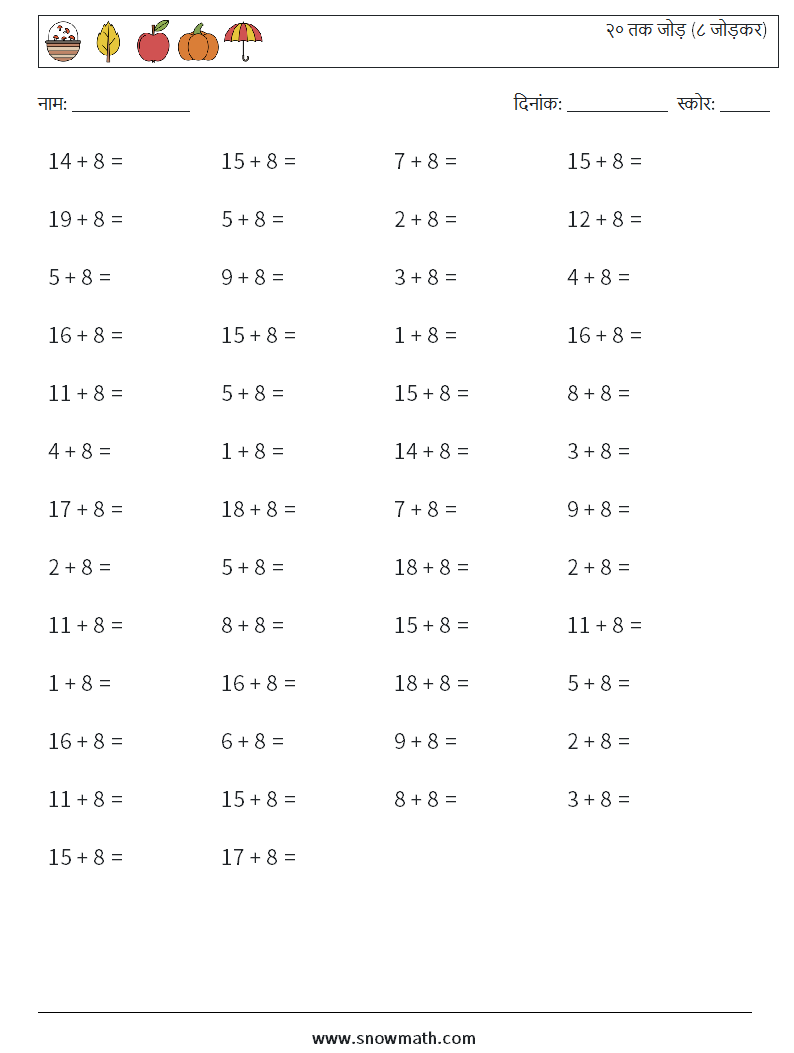 (50) २० तक जोड़ (८ जोड़कर) गणित कार्यपत्रक 8
