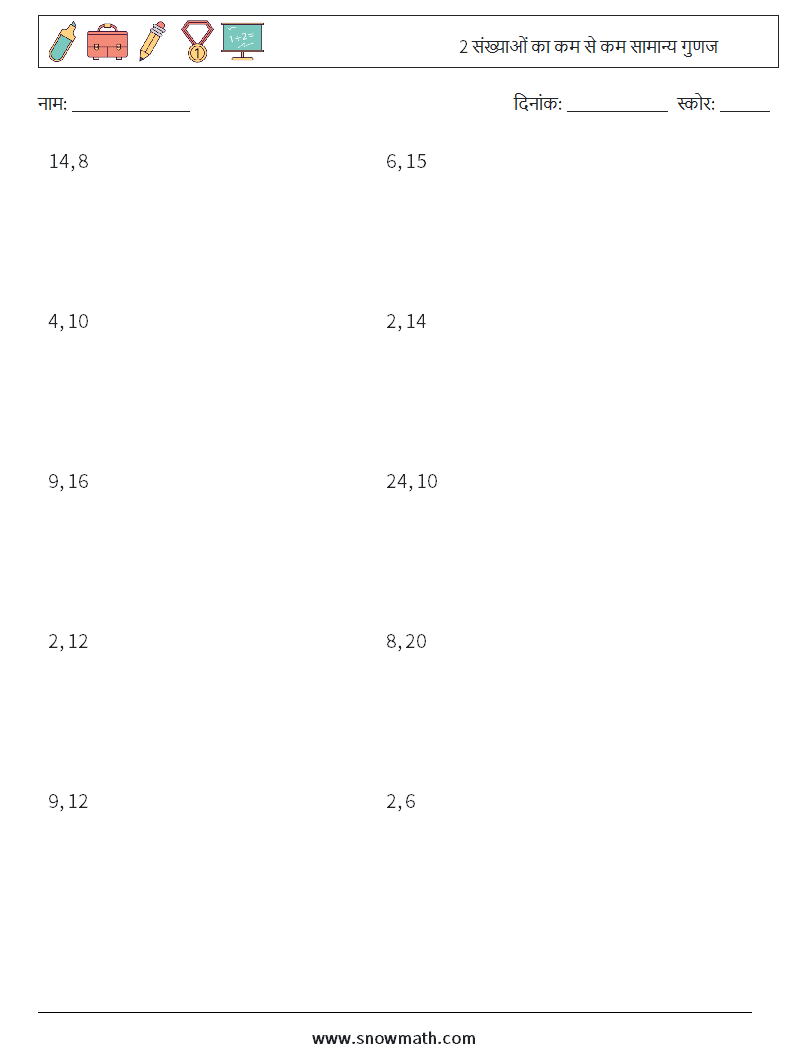 2 संख्याओं का कम से कम सामान्य गुणज गणित कार्यपत्रक 6