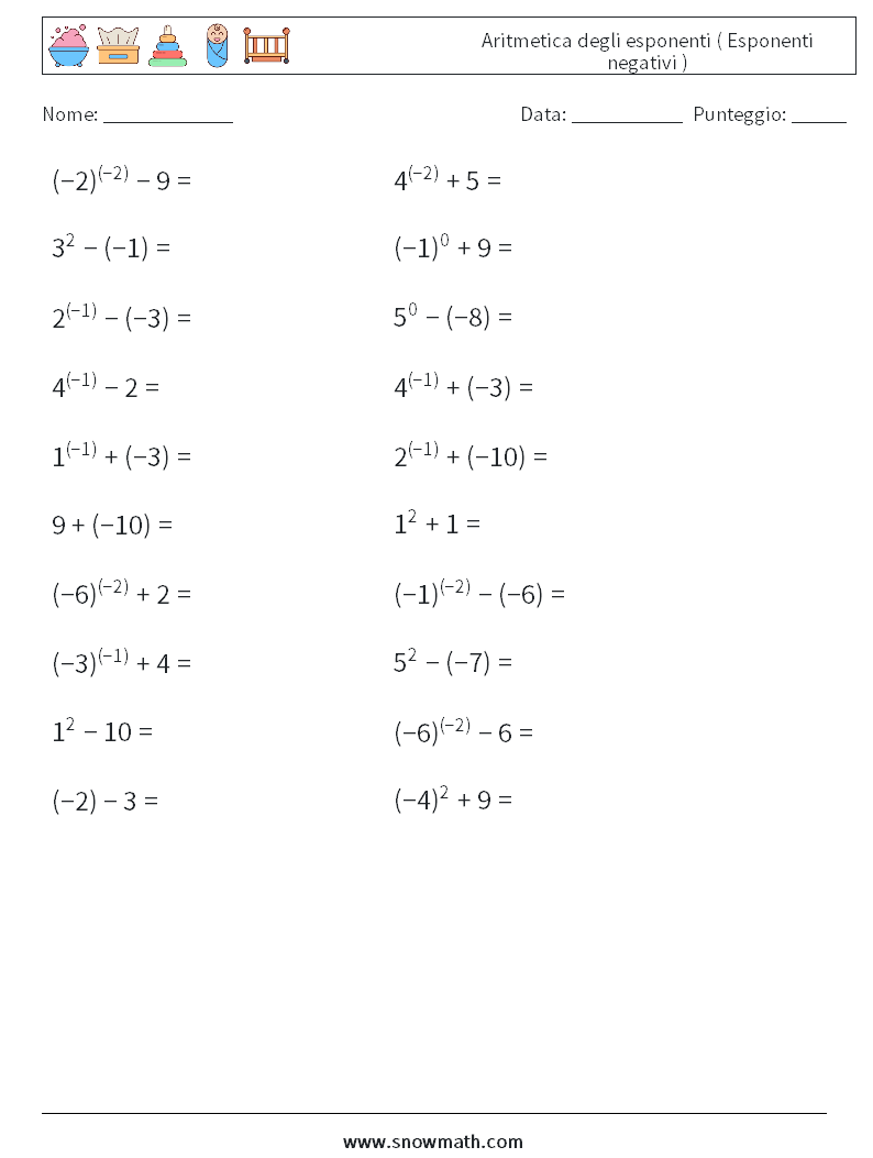 Aritmetica degli esponenti ( Esponenti negativi ) Fogli di lavoro di matematica 9