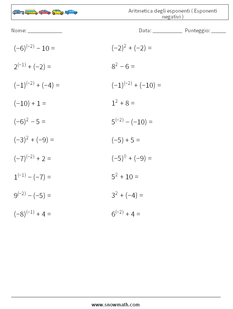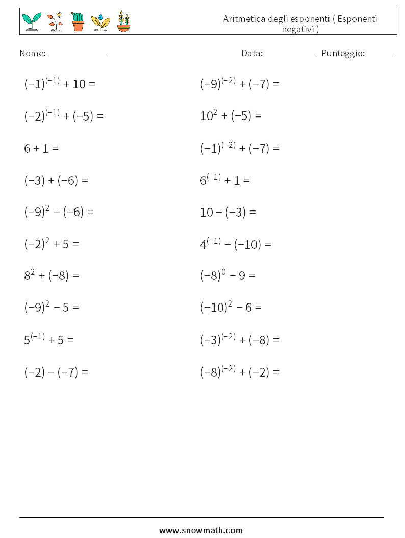 Aritmetica degli esponenti ( Esponenti negativi ) Fogli di lavoro di matematica 6