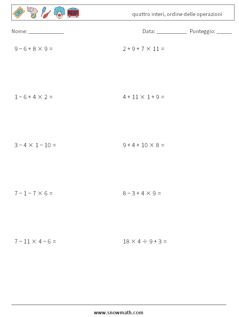 (10) quattro interi, ordine delle operazioni Fogli di lavoro di matematica 9