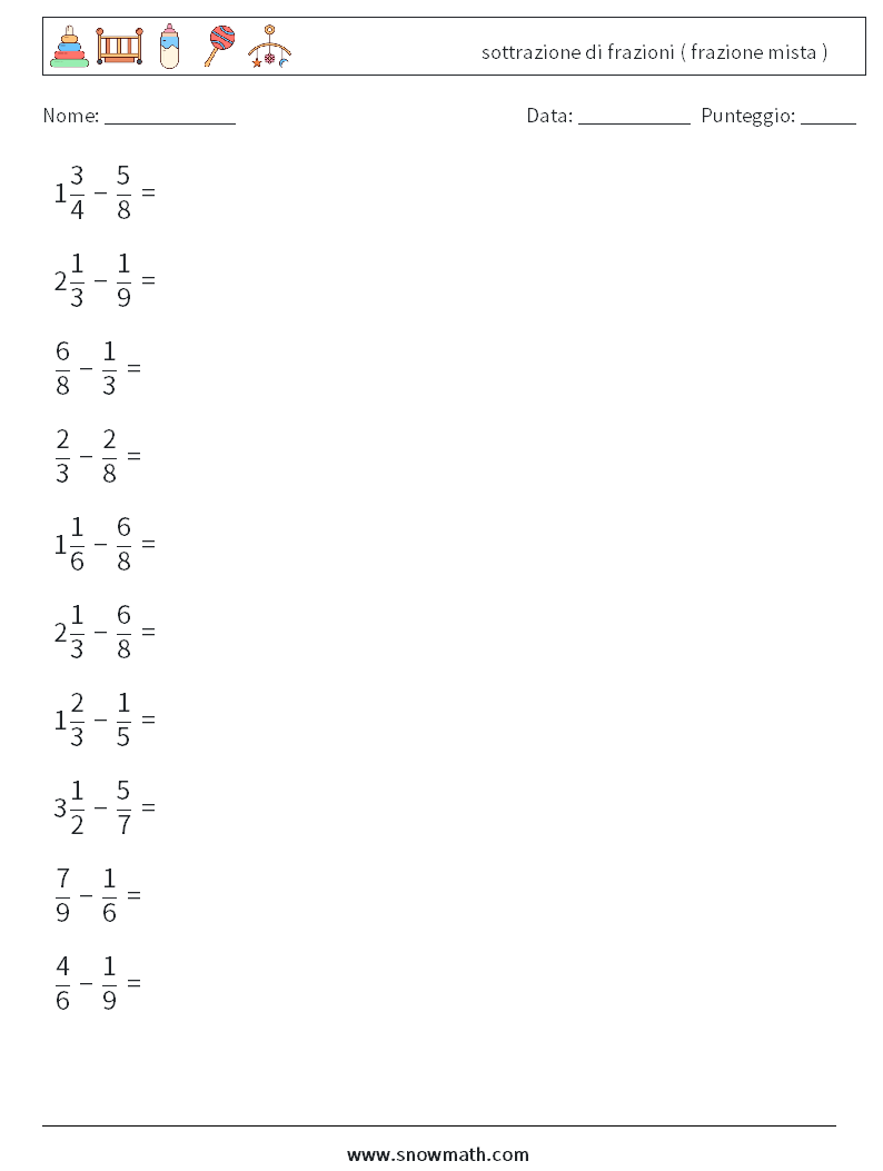 (10) sottrazione di frazioni ( frazione mista ) Fogli di lavoro di matematica 9