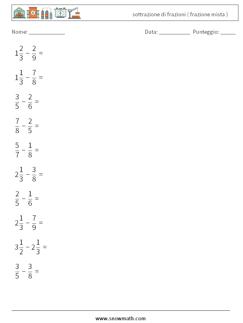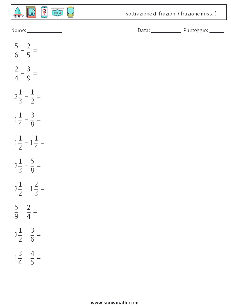 (10) sottrazione di frazioni ( frazione mista ) Fogli di lavoro di matematica 1
