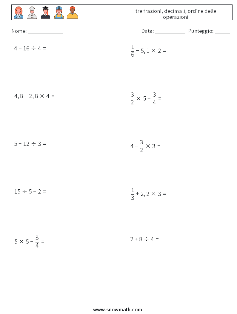 (10) tre frazioni, decimali, ordine delle operazioni Fogli di lavoro di matematica 12
