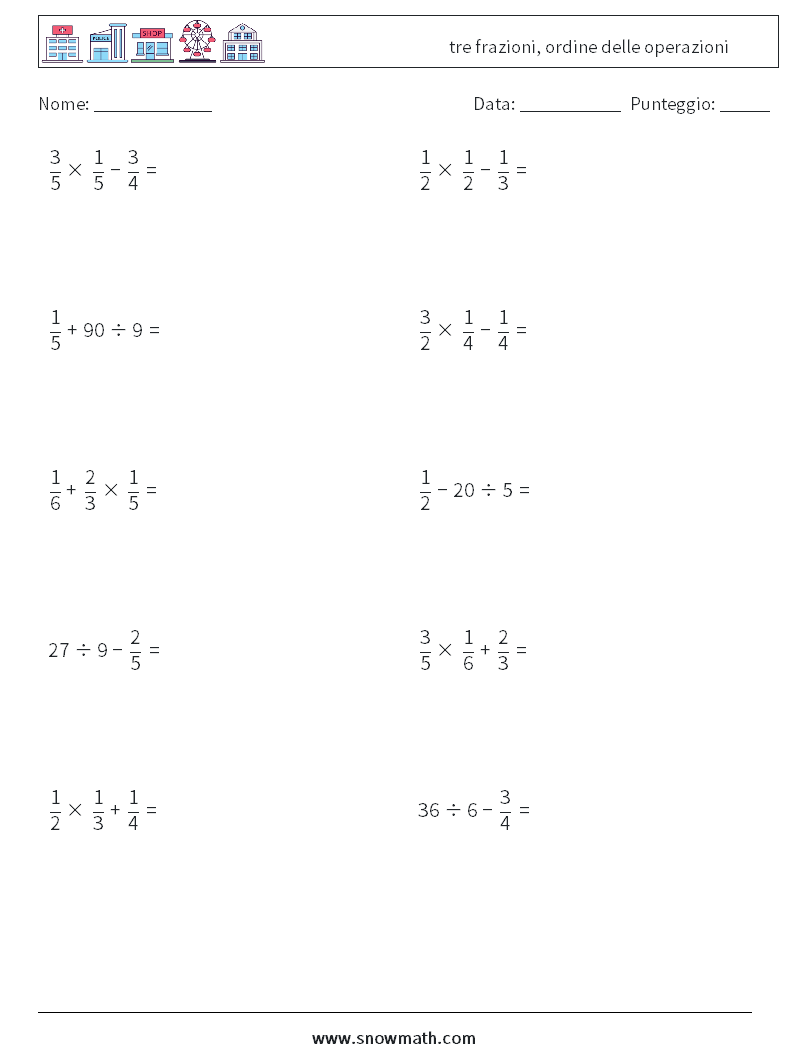 (10) tre frazioni, ordine delle operazioni Fogli di lavoro di matematica 5