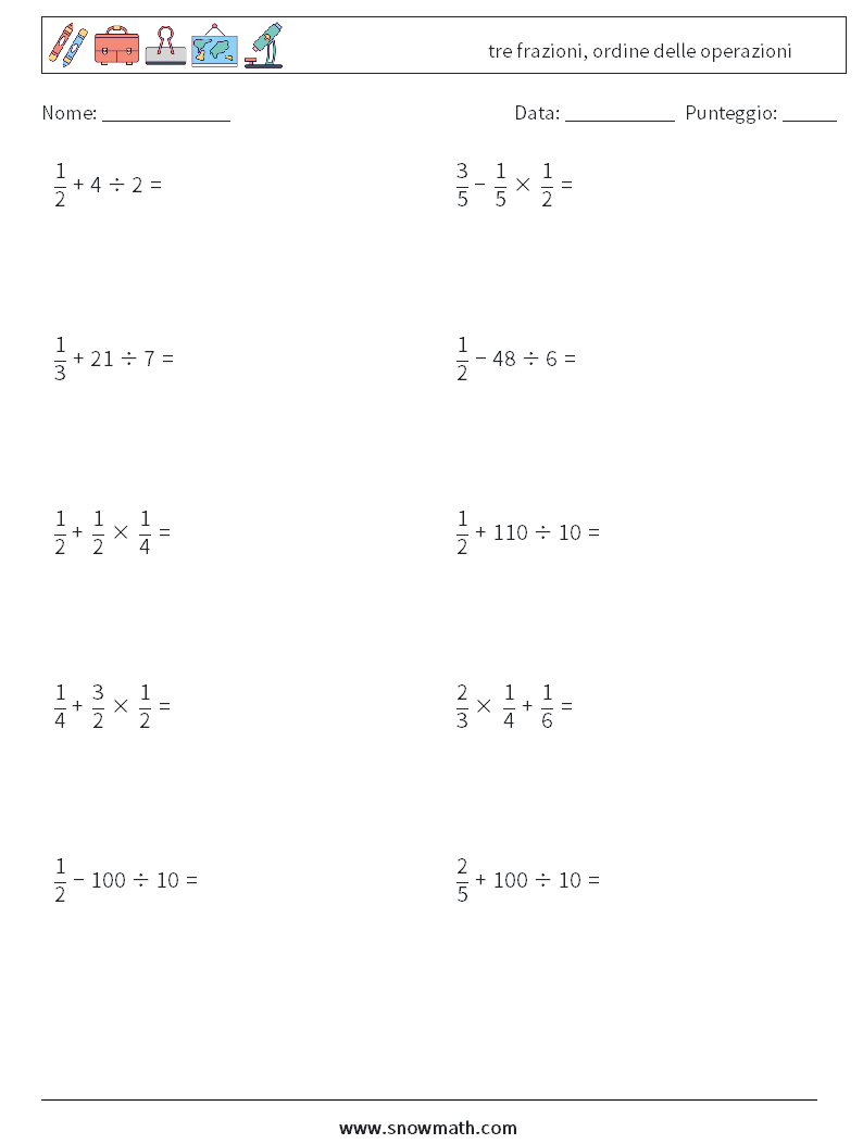(10) tre frazioni, ordine delle operazioni Fogli di lavoro di matematica 1